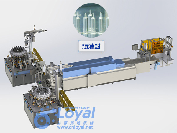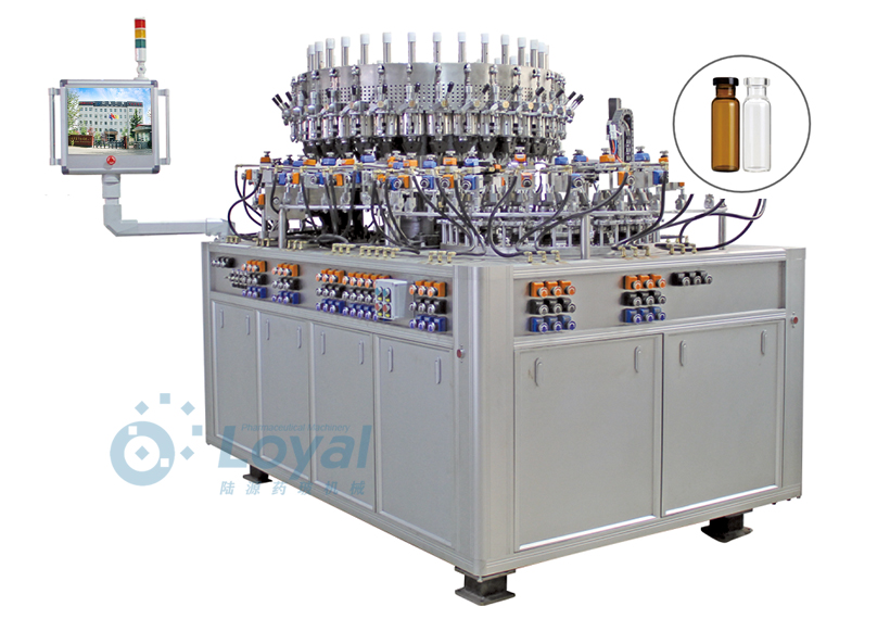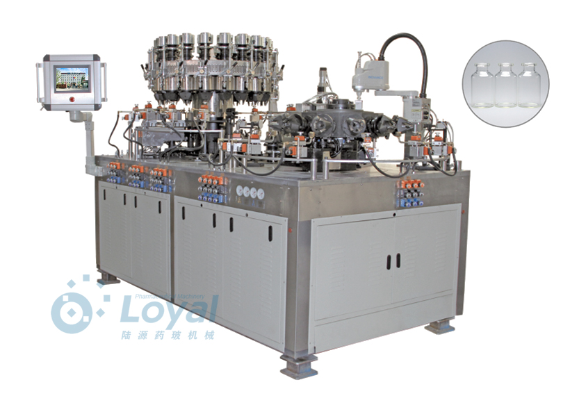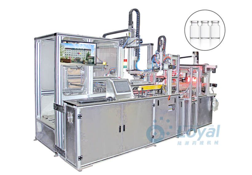 西林瓶生產線包括:自動上管、自動成型、經機械手轉換至前端檢測線(也叫生產管控)、檢測線檢測的項目:1、瓶口內外徑 2、瓶身長短 3、瓶身外徑 4、瓶口邊厚 5、瓶底內凹尺寸檢測;經檢測后的合格品再用機械手夾盤轉換至退火爐網(wǎng)帶上,經高溫減除應力后再降溫,通過氣動吸盤將回火后的小瓶轉換至后端檢測線,后端檢測(也是重檢也叫終檢),經后端拍照檢測項目